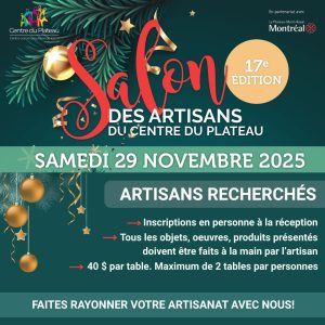 Le Salon des artisans du Centre du Plateau revient pour sa 17e édition le samedi 29 novembre 2025, de 10 h à 17 h! Cet