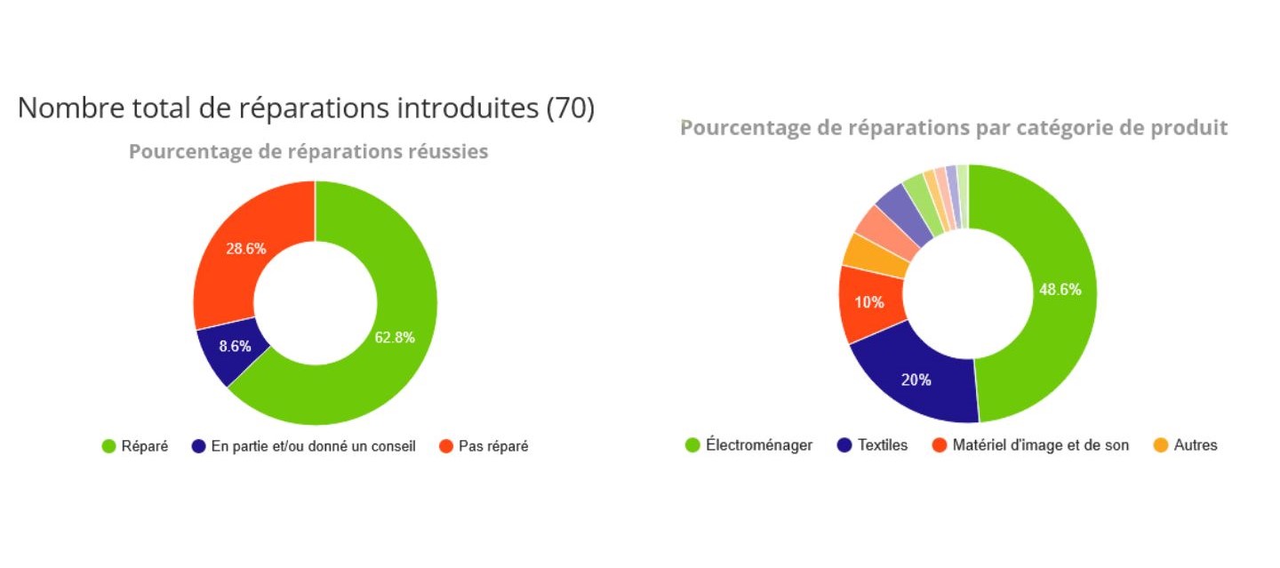Le 29 novembre dernier, une vingtaine de bénévoles (accueil, réparateur.trice.s et couturier.ière.s) étaient sur place pour accueillir les citoyen.ne.s souhaitant donner une seconde vie à leurs objets du quotidien Que ce soit petits électros, équipements électroniques, lampes, petits meubles, vêtements ou bijoux, 70 réparations ont été effetuées (ou tentées) au cours de la journée avec un taux de succès de plus de 60 % !
