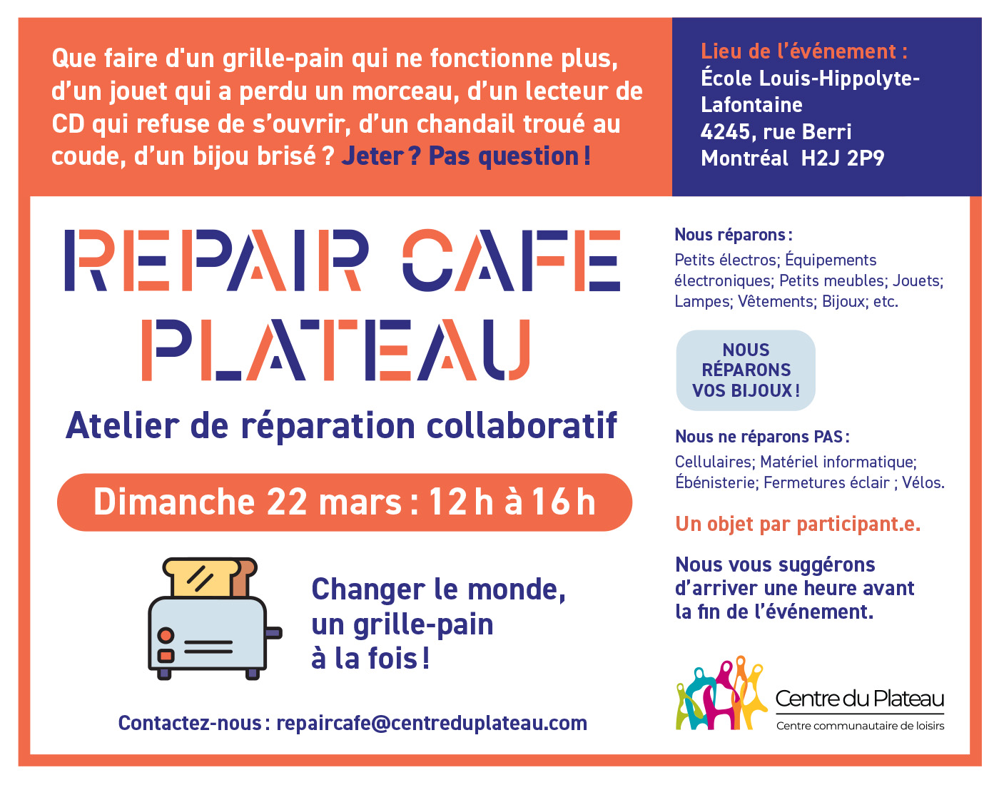 Si vous avez un objet à faire réparer, nos réparateur.trice.s vous attendent au Centre du Plateau le samedi 2 mai entre 10 h et 16 h. Les bénévoles mettront leur expertise à contribution pour réanimer vos objets défectueux. On effectuera le travail en votre présence. Premier arrivé, premier servi.