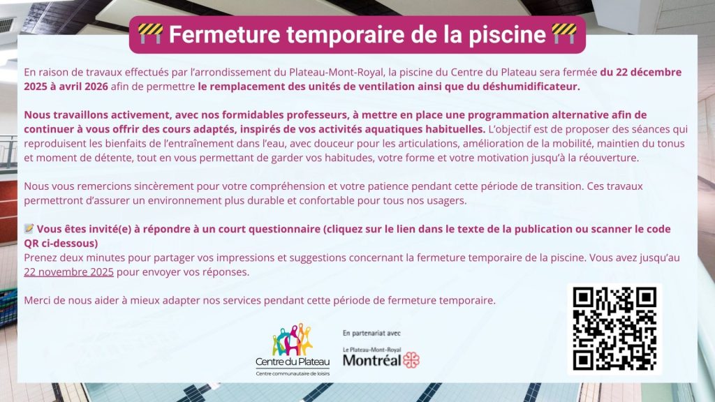 Pour vous détendre où vous entraîner, la piscine du Centre du Plateau vous accueille pour le bain libre et des cours de natation.